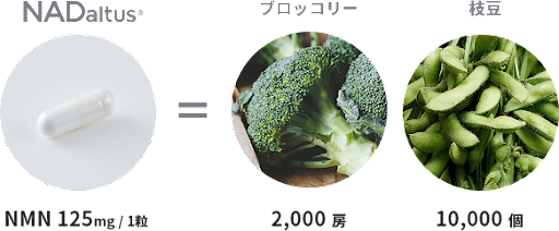 NMNはブロッコリーや枝豆といった食事に微量含まれていますが、通常の食事のみで充分に補充することは難しいと言われています。